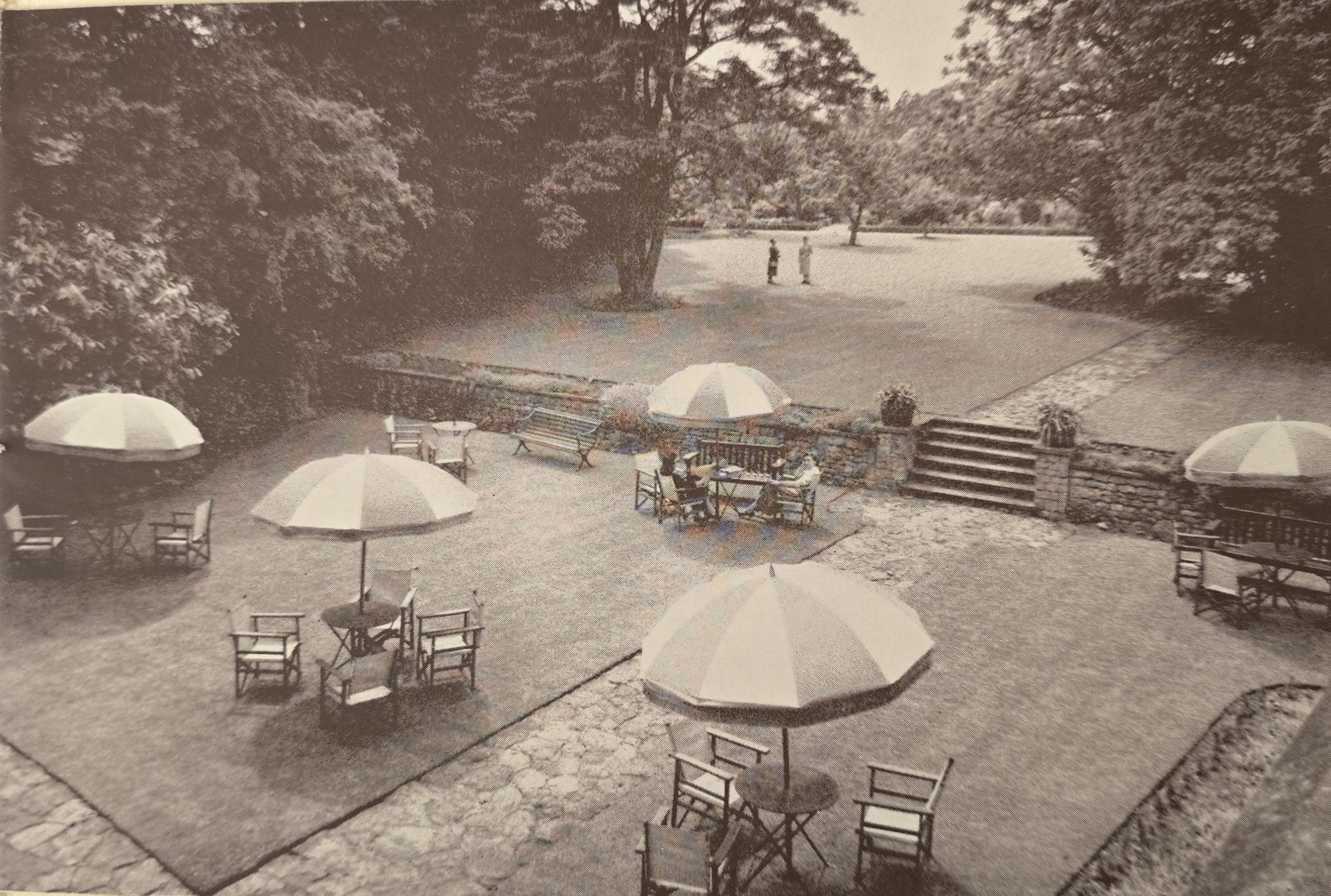 The cellar bar, as it was known, is located under the front lounge with a staircase under the main stairs and one now covered over, just to the left of the main entrance. The staircase was surrounded by wrought iron railings, as was the stained glass tiled window, which looked up through the floor just in front of the reception desk. Both of these features are now located under the sofas and tables.